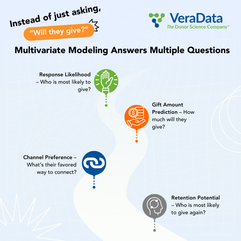 Multivariate modeling takes a different approach by using multiple metrics simultaneously to capture different aspects of donor potential. Multivariate modeling shifts the focus from one data point to a richer, layered view. Instead of just asking, “Will they give?,” these models answer multiple questions at once: